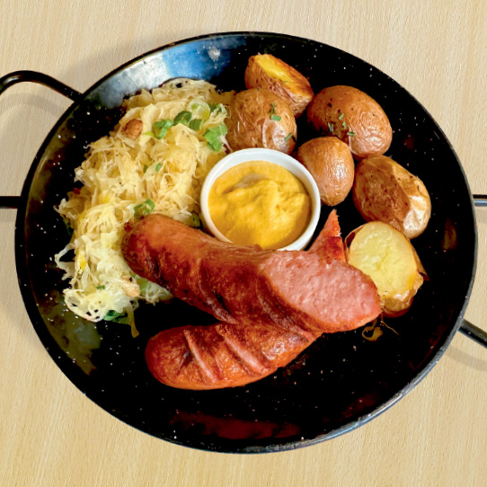 Charcoal-grilled sausages with Bavarian cabbage, potatoes and mustard